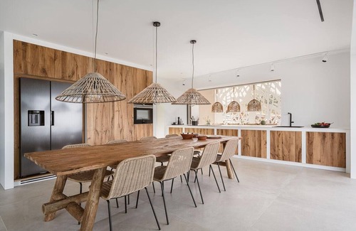 The open plan kitchen, dining, and living area of this villa exudes modern elegance and comfort. The kitchen is fully equipped with sleek countertops, state of the art appliances, and ample cabinet space, making it ideal for cooking enthusiasts. Adjacent to the kitchen is a cozy dining area with a long wooden table surrounded by wicker chairs, perfect for family meals.