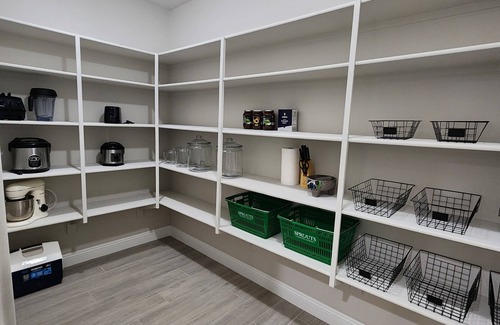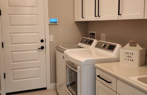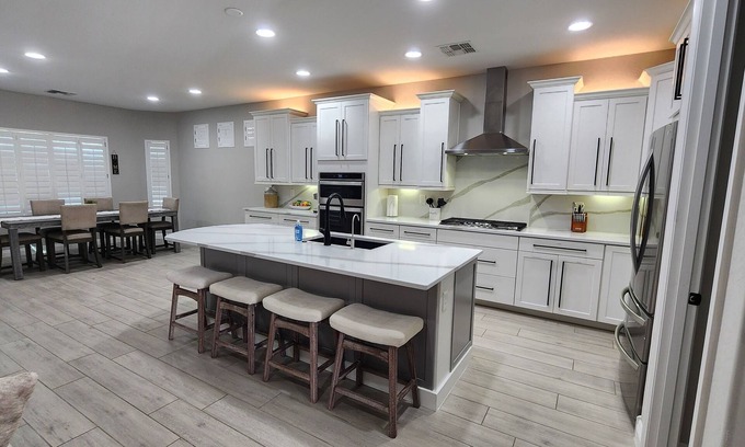 o Kitchen: Features an eight-foot island, perfect for snacks or meal prep, and is fully stocked for all your cooking needs.