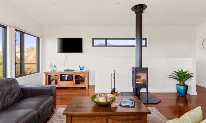 Upstairs features a light filled second open plan lounge also with flat screen tv, dvd player, cd player/iPod dock with Bluetooth, and a Jotul wood fireplace, perfect for those chilly winter nights. Floor to ceiling windows and doors open out onto the impressive outdoor deck which is perfect for enjoying alfresco dining with the outdoor setting, bbq and sea views. The large dining area has plenty of seating along with a fully equipped modern kitchen with dishwasher and microwave for the foodie of the family. You will also find the master bedroom with walk in robe and ensuite. There's also a split system and powder room.