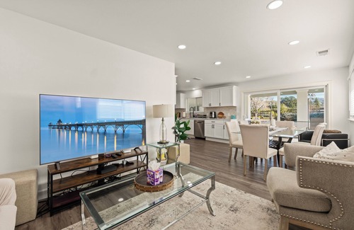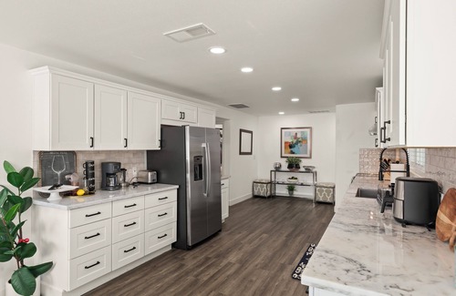 The main house boasts 1,350 sq. ft. of beautifully designed space with three bedrooms, two bathrooms, and a private outdoor oasis complete with a custom jetted hot tub. Just across the driveway, the second home offers 950 sq. ft featuring two bedrooms and two full baths, making it ideal for larger groups or multiple families. Both homes are outfitted with high-end stainless-steel appliances and elegant Calacatta granite countertops, blending modern style with practical comfort.