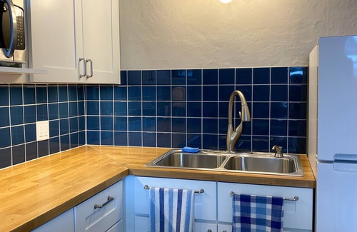 The apartment features a kitchenette with an island for dining, a living room with large screen television and two bedrooms. The main bedroom boasts a king sized bed and a smaller adjacent bedroom has two twin bunk beds. The bathroom has a beautifully tiled soaking tub with shower. Perfect for a couple or a family of three or four.