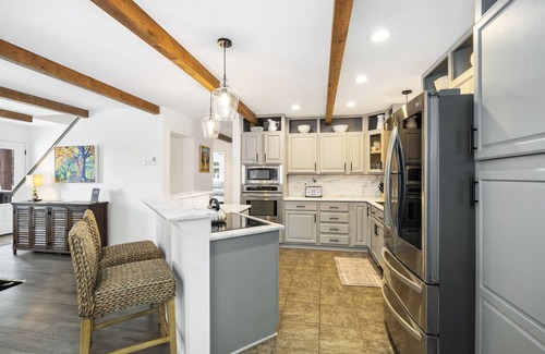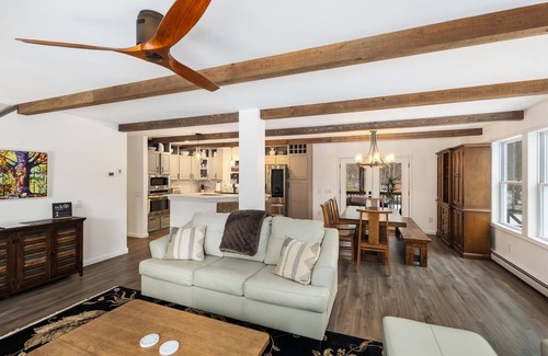 Bedrooms feature fans, quality linens, Smart TVs (in select rooms), and stylish Adirondack decor. Towels, soaps, and extra blankets are provided. A full-size washer and dryer are in the separate laundry room.