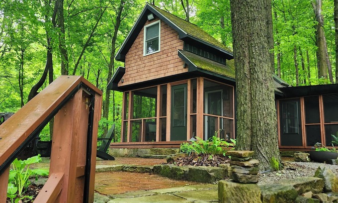 Take it easy at this unique and relaxing luxury getaway. The little cabin in the woods is a one- of -a -kind find. Craftmanship and charm in every detail. Built with reclaimed materials like the bowling alley countertops, metal roof ceilings and antique church-stained glass windows. The setting is in the country with woods, and stream with small waterfall, although easy access to major highways. The cabin has a luxury hot tub on one screened in porch with small frig and table for outdoor dining. And another screened in porch with cozy rockers for relaxing, reading a book or just taking in nature. A loft love nest bedroom with luxury queen bed, kitchen, electric fireplace, one of a kind handmade by owner firepit, beautiful bathroom with antique stain glass windows. Perfect for couples for a romantic getaway for anniversaries, newlyweds, birthdays or just a weekend away. Near Mohican State Forest, Ohio State Reformatory, Malabar Farm, Kingwood Center and Mid-Ohio Sports Car Track. All wheel Drive recommended in winter, long driveway on hill.