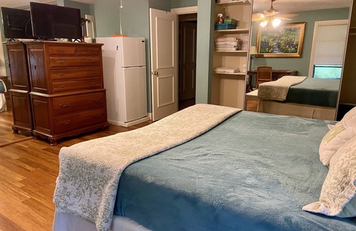 THIS LARGE, COMFORTABLE QUEST ROOM WITH A KING-SIZE TEMPURPEDIC BED AND PRIVATE BATH HAS ACCESS TO THE POOL, SAUNA, BAR-B-QUE, AND HOT TUB, WITH LAUNDRY AND KITCHEN PRIVILEGES IN THE MAIN HOUSE. A HUGE SCREENED PORCH, FRUIT TREES, TENNIS COURT, AND RECREATION AREA NEARBY..
