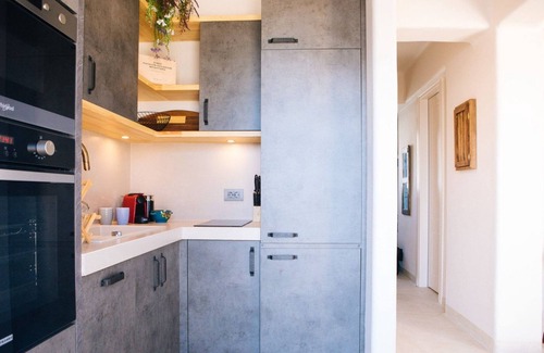 The villa is thoughtfully laid out over two levels. The entrance through the front terrace, adorned with an olive tree, leads into the ground floor, which houses a bedroom with a queen-size bed, a bathroom, an open-concept fully equipped kitchen, and a living room. The living area opens up to the front terrace, featuring a jetted private swimming pool with magnificent sea and sunset vistas. The upper floor accommodates two additional bedrooms—one with a queen-size bed and another with two twin beds. The latter bedroom is designed with an open concept, separated by a tastefully draped romantic curtain for privacy. An additional bathroom on this floor and a balcony offer splendid views of the sea and sunset. Guests will enjoy the luxury of top-quality mattresses and linens.