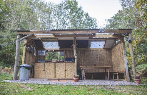 When you’re after a cuppa post-hike, just slide into the covered kitchen outdoors, where there’s a gas cooker and electric coolbox. The tent has a hot shower and toilet, a double bed with a memory foam mattress, a double futon and a tent stove.