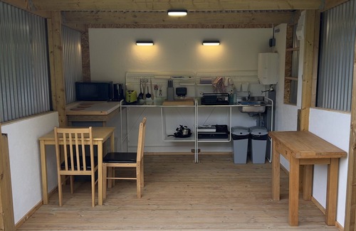 The kitchenette is provided for you to make hot drinks and snacks, and there is a fridge and freezer to keep your supplies cold. Large meals can be made in the fully equipped outside kitchen. The outside kitchen features an electric hob, electric grill, kettle, toaster, microwave and sink. There is also a dining table in the outside kitchen to sit and eat should you wish.