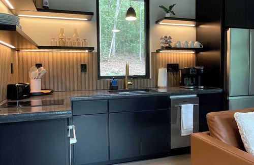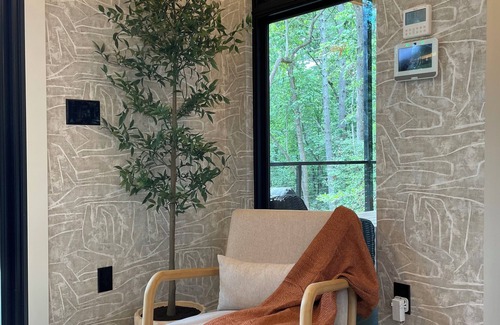 Escape to our cozy yet luxurious two-bedroom, one-bath shipping container home, tucked away in the heart of the woods. Floor-to-ceiling windows flood the space with natural light and offer stunning views of the forest. Inside, enjoy two full beds, modern amenities, and stylish design—perfect for a relaxing retreat.