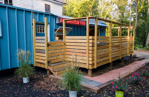 The first Luxury Shipping Container in Warrenton, NC. Built with the help from many of the talented community members and the finished product is something special. It is 320 sq feet including the 80 sq foot bathroom with dual waterfall showers and 9 foot 6 inch ceilings. It has a garage door that opens up to the 250 sq foot enclosed deck for your furry family member(s). Smart lighting with 16 million color choices, Spectrum 400 MB Internet, Amazon 3D speaker, and TV with Prime and Netflix.