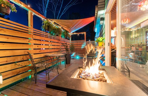 "Tiny Sun". The newest Ultra Luxury Shipping Contain built by the talented community members. In total there are 3 luxury tiny homes on the property, all available through Airbnb. It is 300 sq ft including the 80 sq ft bathroom with dual waterfall showers and heated floors. Lotus flower lights hang from 9 foot 6 inch ceilings. 200 sq ft enclosed deck for your furry family member(s). Smart lighting with 16 million color choices, 400 MB Internet, Amazon 3D speaker, TV with Prime/Netflix.