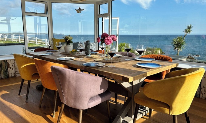 Situated on the beautiful 'Cornish Riviera', 'The View' is a wonderful, 5 bedroom house with beach access (direct from the garden) and breath-taking, 180-degree sea views. The house and view certainly has the 'wow' factor (especially when viewed from the hot tub!) In the drive, there is off-street parking for 4 cars. The heart of the home is the spacious sitting room with large sliding doors allowing you to relax on any one of the 4 comfy sofas and take in the incredible sea-view. The room is tastefully decorated with interesting, original artwork and vintage film posters. It's fully equipped with a flat- screen TV, a log-burner, a vinyl record player (with classic albums!) and a decorative juke box. This room is a cool and cosy space for the whole family! The large, spacious, kitchen / dining room is a fabulous space to host family meals allowing everyone an incredible sea-view. The master bedroom also has wonderful sea-views, a walk-in wardrobe and an en-suite with a large shower. There are 3 further double bedrooms which share a large family bathroom with a bath and shower. There is also a Quad room, ideal for younger members of the group which has its own bathroom with large shower. Kids and pets are more than welcome! (they would love it here!)