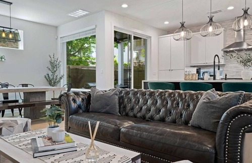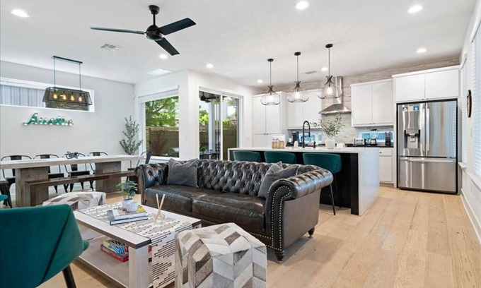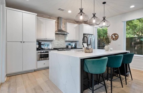 Modern 4-bedroom, 3.5-bath home in East Austin, perfect for groups of up to 9. Enjoy stylish interiors, open living spaces, and a fully equipped kitchen. The private yard offers fun outdoor games, ideal for relaxing or entertaining. Located just minutes from downtown, with fast Wi-Fi, smart TVs, and walkable access to top dining, music, and nightlife. A perfect stay for families, friends, or work trips