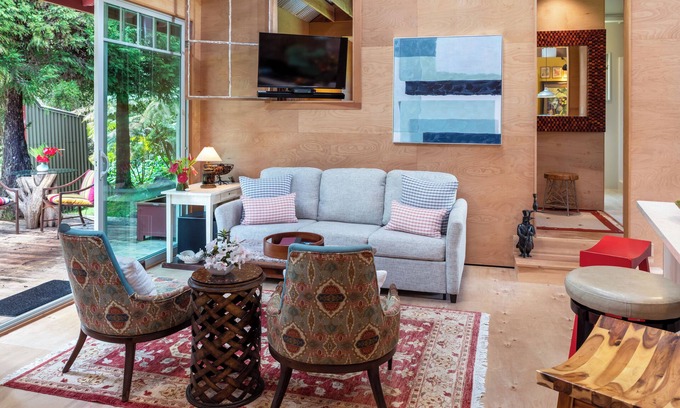 This modern suite is ideal for the traveler seeking an extended stay or an elegantly furnished retreat in the Volcano area. Featuring lofted ceilings, high-end finishes, and a fully equipped kitchen, it provides ample space and style. Relax in the cozy sitting area with a smart TV (no cable) or pull out the 'pune' sofa into a queen-sized bed. The dining area leads to a private lanai, complete with a fire pit for relaxing evenings and a private 4-person hot tub. For larger groups, this unit can connect to Poliahu, creating a perfect shared space for friends or family.
