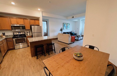 This apartment features a fully-equipped kitchen, in-unit laundry, lightning-fast WiFi, smart TVs, and complete privacy throughout your stay. Additionally, there is no need to worry about expensive parking fees - This location offers free parking for two cars in the attached garage and additional free parking in the parking lot.