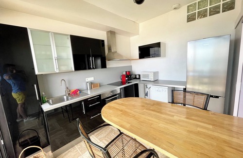 - Large, open-plan, fully-equipped kitchen with sea view (oven, microwave, dishwasher, fridge, freezer, kitchen equipment, coffee maker, kettle, toaster, etc.).
