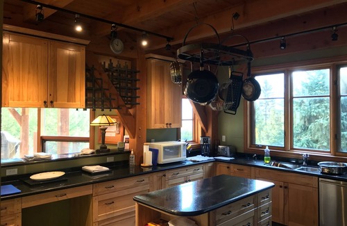 The Luxury Timber Frame Chalet features exceptional amenities designed to enhance your stay. A unique soapstone fireplace creates a warm atmosphere, while the spacious dining area with a custom larch table accommodates up to ten guests, perfect for intimate wedding receptions. The gourmet kitchen is equipped with granite counters and high-end appliances, allowing you to host memorable culinary experiences or arrange for a private chef to cater your celebration. Original artwork and historical touches throughout the home add a sense of character, making it feel like a true retreat.