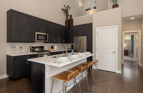 This two-story townhouse accommodates up to six guests in two bedrooms. The second-floor primary bedroom has a king bed, a closet, and an en-suite bathroom with a vanity and a shower/tub combination. Downstairs, the second bedroom has a queen-over-queen bunk bed, with an adjacent bathroom equipped with a shower.