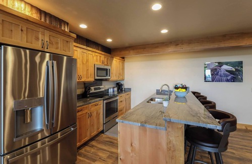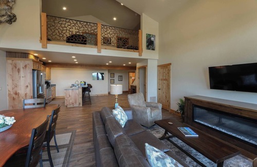 The main floor* layout is an open living concept with a spacious kitchen, dining, wet bar, and living area. The second-floor loft area provides a queen size pull-out couch for additional sleeping and sitting as well as a laundry room with washer and dryer. The Glacier unit loft has a large sitting area and game room with a custom made, Montana made and inspired, cowhide game table.