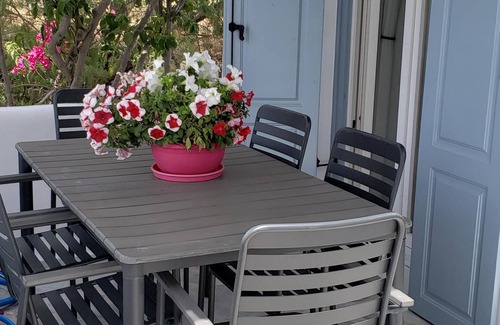 The beautiful Townhouse villa is located in the peaceful and picturesque area of Ornos. Only 300 meters from the beach and a 5 minute ride from the main town. A gated private development . The townhouse comprises of two floors. Two bedrooms two baths with a front veranda overlooking the pool and a back porch off the kitchen. Each level has its own bedroom and bath. Both bedrooms have Queen size Serta posturepedic mattresses, built in closets and over sized windowed baths with Vanity cabinets. Seperate Living room with a sofa bed, doors open to the veranda with arched entrance. Views are open and private. Interior ceilings are decorated by traditional style wooden beams. Floors are traditional myonian style with a marble border in the living room. Top of the line appliances include a washer A/C . Fully equipped kitchen coffee maker, Nespresso machine, toaster, microwave etc. Complimentary maid service on every 3 days and handyman on premises.