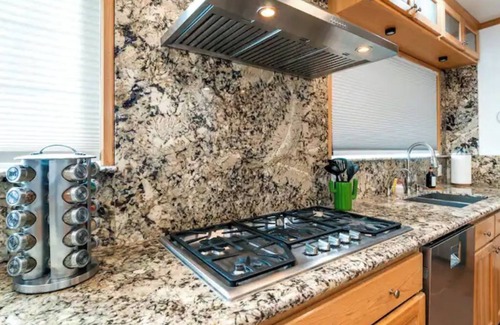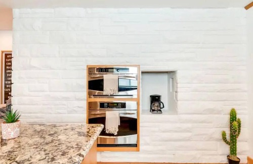 This home has a Smart TV, Full Kitchen: Refrigerator, Stove, Sink, Microwave, Coffee Pot, Cooking Ware, Plates, Cups & Utensils, Complimentary Washer, Dryer, and detergent is also provided.