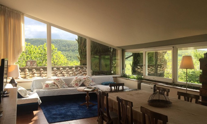 La Vittoria 10 is a traditional Tuscan Country Villa surrounded by greenery, forests and our olives grove. Strategic location for easy access to the many hot springs in the area, Bagno Vignoni, San Filippo, and to visit Montepulciano, Pienza, Cortona, amazing towns from the Tuscan Renaissance. Montalcino with its worldwide famous Brunello's vineyards is only 40 min driving from home. We can arrange private Wineries tour and tasting at the most prestigeous wineries. The apartment measures 300mtq. and it has two large , cozy and extremely comfortable suites with bathroom ensuite, that can accommodate up to 8 people. The large rooftop lounge welcomes you with its comfortable sofas after a day of hiking and exploring .The large professional kitchen is at your disposal if you want to enjoy a dinner in total freedom! The fireplace room will give you moments of warm intimacy in the colder months, perhaps enjoing a good glass of wine! Original High ceilings with exposed beams, fine furnishings, the comfort of the beautiful beds , and top quality linen are the strengths of our house. H24 support is offered, for every need, and children are welcome!