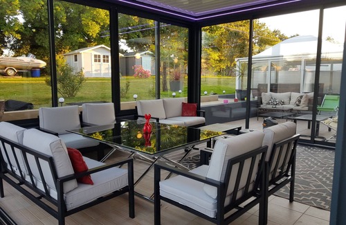 south terrace of 100 m2 with barbecue, summer dining room, large slate table, sun loungers, garden furniture, no swimming pool per se, but a spa balneotherapy area, jacouzi with heated water at 37 ° serving in all seasons and whatever the weather, with 1 large, very powerful bubbling spa for 5 people, zen LED lights changing colors. for wellness sessions at night. The spa is on the terrace but covered under Plexiglas shelters with sliding windows.