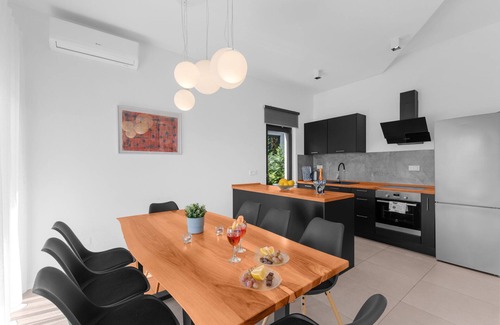 Visit a wonderful family Villa Abstracta located in a small place Vabriga near Porec in Istria. A 4-star villa has 4 bedrooms and can accept up to 10 persons on 2 floors. This unusually shaped summer house is a great choice if you are planning to spend your vacation in a peaceful neighborhood, not far from the sea.