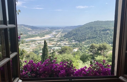 Door leading to a beautiful private terrace with BBQ, table and chairs and bougainvillea climbing the surrounding walls. Stunning views of the lights of Nice below. Floodlit lighting under the ancient olive trees.