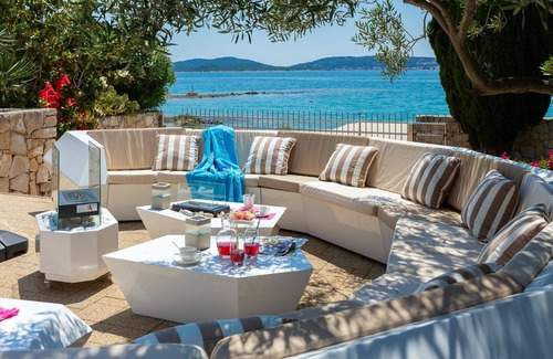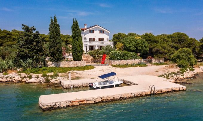 Surroundedby untouched nature, the Luxury Villa Bella Vista with a swimming pool is an ideal accommodation for a luxury vacation in a peaceful and quiet place, away from any kind of noise. It is located nearBetina on Murter, in the middle of beautiful Dalmatia and its design and peaceful surroundings will provide you a relaxing vacation abroad. The Villa Bella Vista has access to the beach that is right in front of the villa. Those who want to create their own peaceful oasis while enjoying the sun and natural beauties will find this place a perfect destination.The luxury Villa Bella Vista consists of a ground floor, where our guests can enjoy a spacious living room with TV and DVD, and on a rainy day here you can light a fire in our fireplace. Here you will find the main fully equippedkitchen and a dining table. From the living room, a big doorleads you to a beautiful terrace which is overlooking the sea. On the terraceis a table where guests can enjoy their meal at any time of the day or just sunbathe and enjoy the beautiful sight. The whole villa is surrounded by a Mediterranean garden (palm trees, agaves, rosemary, mandarin, etc).Our guests can also use and enjoy the outdoor stone barbecue, but if you want we will be delighted to prepare meals on thebarbecue for you while you can enjoy your relaxation. In the yardare thepool and beach chairs where you can enjoy looking at the crystal blue sea and soak up the sun while refreshingyourself in the pool. The area around the pool has an outdoor shower, dressing room and bathroom, as well as a mini playground for children.The first floor of the villa consists of two wings, each of them is divided into two floorswith its own staircase. In each wing, guests have access to three bedrooms with king-size beds and one room for the kids. Each wing has two bathrooms and two separate toilets. The open living area is equipped with a seating set, TV, and a DVD player. Here you will find one more kitchen. The exit from the living room leads you to a terrace with garden furniture, where during the day you can enjoy the view of the sea and the island of Murter, while in the evening you can listen to the sounds of nature and watch the starry sky.All rooms in the villa have a TV, personal safe, non-allergenic pillows, and Wi-Fi internet access. You can choose between silk and cottonbed sheets which will be changed twice a week. Natural soaps and shampoos are also a part of ouroffer. If you have a licensefor boats, you have a boat of 5,5 m on disposal.