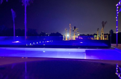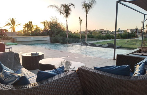 Luxury Villa Illy d'architecte moderne and confortable with vieaw on golf and mountain Atlas. Luxury Salon and diner table with view on the pool and the garden. At 5 minutes from the souk of Marrakech by car or taxi. Dining area and full equiped kitchen. With 9 suites confortables on suit bath room each. Hammam with shower and massage room. Cinéma room and fitness room ! Only for families group and quiet groups. Villa only for families No music or guests or prostitues En extra charge : Electricity, meals, shooping delivery , house keeper, chef ...