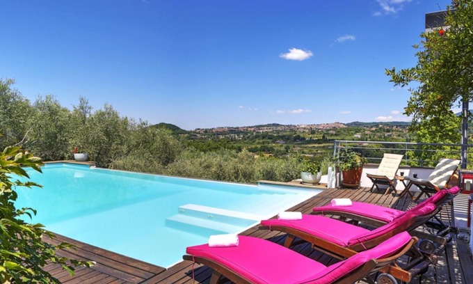 Pool Outdoor AreasA highlight of the property is the 6x12 meter infinity pool, overlooking the beautiful countryside of the Castelli Romani. It's the perfect place to soak up the sun or enjoy a swim at sunset. Equipped with sunbeds, umbrellas, pool towels, and a built in outdoor shower with hot water. Open year round (not heated).The fenced park is landscaped with Mediterranean vegetation and features:Relaxation areas and English style lawnOutdoor dining area with stone barbecue and large wooden tablePlayground for childrenTwo levels of private parking