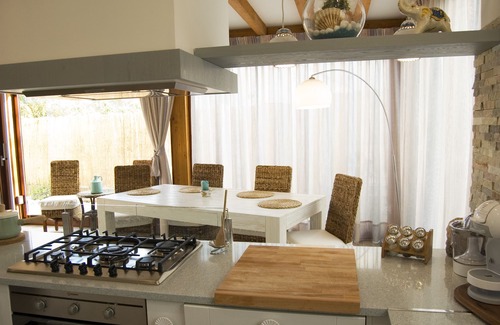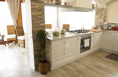 Villa Irene is a single storeyed house all on one level with stunning, bright and comfortable rooms. The living area with the kitchen are the focal points of the house , spacious and furnished with valuable items, surrounded by windows giving views of the Zen style garden where one can relax during the day or dine under the stars in the evening. The windows have double glazing and insect screens, so the windows can be left open (all the windows are fitted with an up to date alarm system) as an alternative to using the air conditioning.