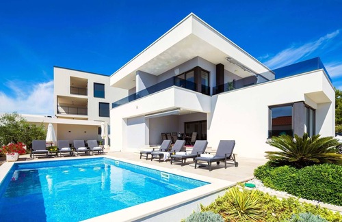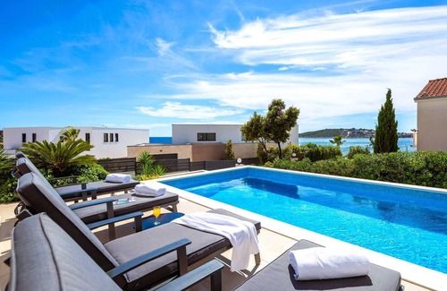 Rent modern Villa Tempera near Trogir and havea wonderful vacation. Villa is nestled 30 meters from the crystal blue sea and only 50 meters from the lovely beach. From almost every corner of this beautiful holiday villa, you can enjoy an undisturbed sea view. A restaurant, cafe bar, and bakery are all within a 10-minute walk from the villa.