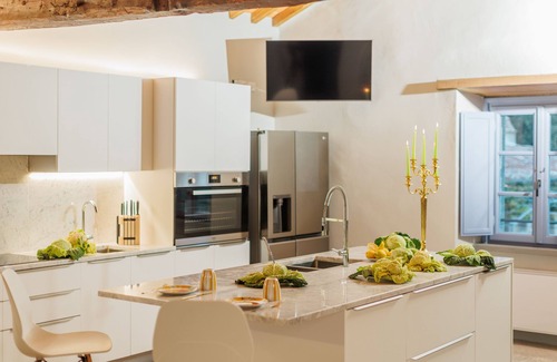 Surrounded by nature, Nello's Villa offers a unique view of the Etruscan town of Cortona, located just opposite. The modern swimming pool with waterfall located in the garden just below and the large terrace offer intimate corners of relaxation for guests. Close to the swimming pool there is also the spa area, a heated environment with jacuzzi, a fireplace for cold winter evenings and a bathroom. Concerning the main villa is spread over several floors. On the ground floor there are 2 bedrooms and the spacious cellar where it is possible to have tastings in company. An internal staircase leads to the first floor where there is a large and well-equipped kitchen with a beautiful fireplace and guests can access to the terrace overlooking Cortona and the large garden. Always on the first floor, a corridor from the kitchen leads to the sleeping area consisting of 3 double bedrooms, each one with en suite bathrooms with shower, and an internal room, formerly a small church, with both ancient and modern style frescoes. In the same room it is possible to have lunch or dinner as it is equipped with a large table where guests can gather to spend unforgettable evenings. A further staircase leads to the last room located in the small tower. It consists of a French bed. Lastly, along the last flight of stairs you enter the attic where there is a living room with a view of the garden and the town of Cortona, equipped with tasting glasses, where you can sip a glass of wine in relaxation and company. All the rooms are finished with refined pieces of furniture and materials carefully selected by the owners, in a mix between classic and modern style. Outside and adjacent to the main villa there is the dependance which develops in 4 bedrooms, all equipped with an ensuite bathroom and if necessary, an air conditioning/heating system, as in the rest of the villa. Through short trips by car you can easily reach important historical and artistic towns in Tuscany and Umbria, such as Cortona, Castiglion Fiorentino, Arezzo and some places along Lake Trasimeno.