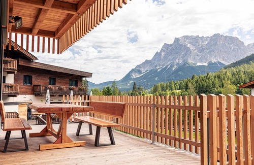 These detached, luxury chalet-type wellness villas are located in Biberwier, Austria, at the foot of Germany's highest mountain, the Zugspitze. The chalet villas are located in the small-scale holiday park Alpenchalets Biberwier, which opened at the end of 2021. It is located directly on the ski slope, approx. 500 m from the valley station of the Marienbergbahn, approx. 25 km from the famous German (winter sports) resort Garmisch-Partenkirchen. The two-storey chalet villas are built entirely of wood. This gives you that genuine nice traditional Austrian atmosphere inside, but with all the comfort you could wish for. The decor is modern and tasteful. On the ground floor, you will find a spacious living room with TV. The open plan kitchen is fully equipped with features like a dishwasher and oven. On this floor, you will also find a bathroom with a traditional sauna and shower. The second floor has one 4-pers. bedroom with a bunk bed and three 2-pers. bedrooms, one of which has a private bathroom with shower and toilet. There also is a separate bathroom with a shower and toilet. Outside, you will find a terrace with garden furniture and hot tub to relax after an active day of hiking/skiing. There is a balcony on the first floor. From here, you can enjoy the beautiful view of the Zugspitz massif. There's parking space for two cars directly at the villa. At holiday park Alpenchalets Biberwier, various chalet villas can be booked for eight to ten people.