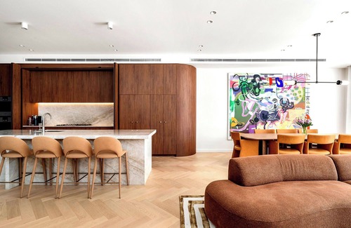 On the ground floor, a wide hallway leads you, on your left, past a TV room and a neat built-in study area. To the right, there's a full laundry with its own side entrance, and a modern bathroom. The heart of the home is the large open-plan kitchen, dining, and living area – a great space for everyone to gather or enjoy on your own. The chef’s kitchen is designed for those who love to entertain, with top-quality Gaggenau appliances, including two ovens and two dishwashers, plus a butler’s pantry to keep things tidy. Pull up a seat at the kitchen island and chat while you cook, or set the large dining table for a special meal.