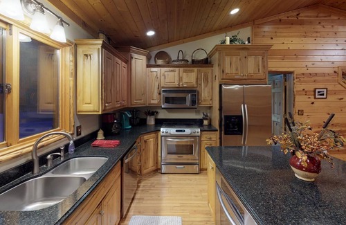 This luxury cabin boasts impressive amenities that enhance your wedding experience. Enjoy a spacious and beautifully furnished kitchen equipped with two ovens, perfect for catering your dream reception. The property features seven private bedrooms and multiple bunk rooms, ensuring everyone has a comfortable place to unwind after celebrating your vows. A large game room is ideal for entertaining guests, while the romantic river rock fireplace adds a cozy ambiance. Step outside to your own private bay and U-shaped dock, where you can host intimate lakeside ceremonies or revel in evening festivities around the fire pit, roasting s'mores against the stunning backdrop of nature.