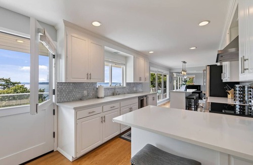 There are a total of 6 bedrooms and 5.5 bathrooms in the home. The master bedroom, located on the main floor, is equipped with a King bed and features an ensuite bathroom and outdoor access. Many of the bedrooms have 180 degree views of the Puget Sound and the Olympic Mountains (weather and cloud cover dependent). 3 of the guest bedrooms feature their own full ensuite bathrooms. Among the guest bedrooms you will find 1 King bed, 3 Queen beds and 1 Full with a Twin trundle.