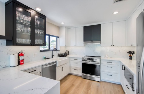 Step inside to find luxe elements of design at every turn, from the waterfall stone and stainless steel appliances in the kitchen to the chic wet bar with a beverage fridge, glassware, and leather stools. There's also ample seating - for meals around the dining room table and for movies in the plush living room afterwards.