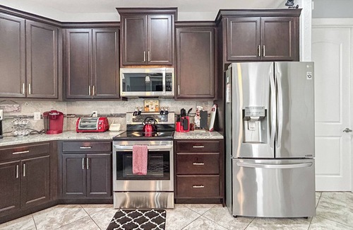 The modern open kitchen is loaded with everything you could ever need. There are plastic cups for around the pool, a blender for frosty drinks and loads of spices, oils and everything you would need to make a great family feast.