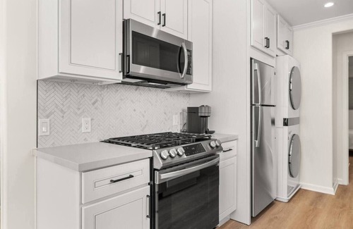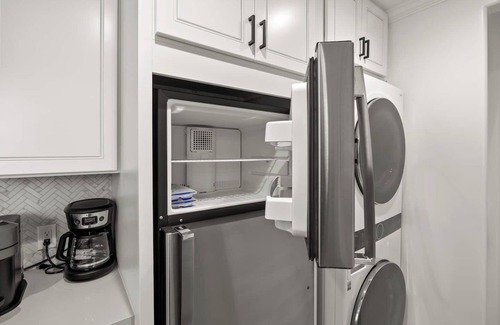 The living area is cozy and inviting, with comfortable seating, a pull-out sofa, and another smart flat-screen TV with 100+ channels for your entertainment. The kitchen has been recently updated and comes fully stocked and features all the appliances and utensils you need to cook up a delicious meal at home including a Nespresso to make a great cup of coffee in the morning.