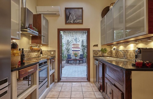 The Charming French Cottage is a 850-square foot circa 1870 winegrower's cottage with heated pool, lush garden, sunning/lounging area, outdoor dining terrace and courtyard. Situated in the Minervois wine region, LPC is designed to reflect its viticultural history. The cream-colored walls of the Wine Cottage and Barrel Barn change hue with the glorious South of France light, complementing a ‘harvest’ palette of ochre, red, orange, purple, gold, silver and bronze contemporary and antique furnishings. Floors of modern and antique tiles ground the interesting mix of decorative items of glass, mirror, wood and metal – many of which are vintage winemaking and agricultural items -- adorn the space.