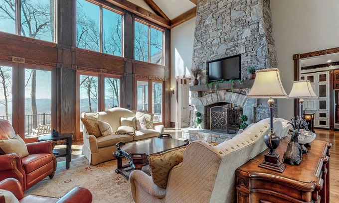 Welcome to luxury in the Blue Ridge Mountains, between Highlands and Clayton, Georgia. Our custom built mountain retreat is in an area undamaged by Helene. It has floor to ceiling fireplaces, abundant 20 ft. windows, with indoor pool, fabulous custom wine room, billiard room, separate game room and breathtaking long-range layered views of the mountains and Sky Valley. At approximately 3,800 feet, the 2-story, 9,600+ sq. ft. house is located in a paved-road community in Northeast Georgia that borders North Carolina. It is a house for every season, providing spectacular sunsets year round.