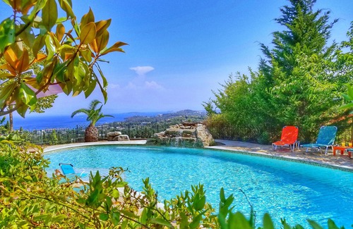 Private luxury villa offering uninterrupted, breath-taking 180 degrees sea view, built entirely of wood on an amazing plot of 4800 sqm, surrounded by trees, with a totally private and fenced kidney-shaped, led-lighted 65sqm pool, ideal for families with children and groups, initially constructed as a luxurious permanent residence, fully air-conditioned and equipped. Guaranteed to give you an unforgettable experience.