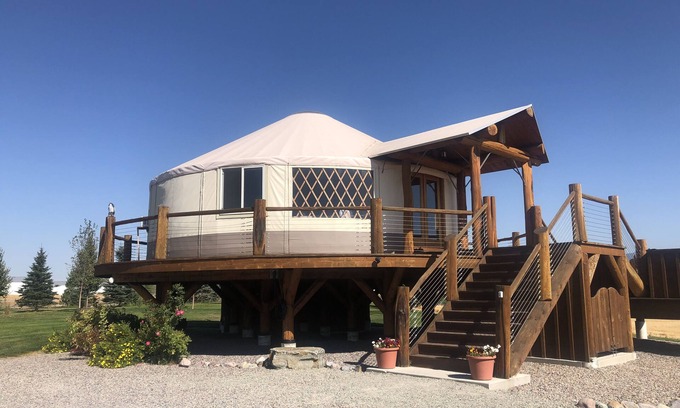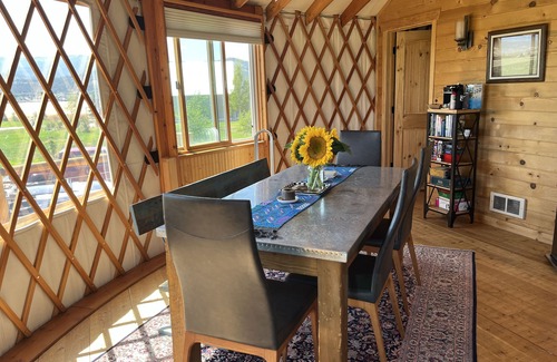 This 2 bedroom yurt is located on our farm down a private road on the northern end of Flathead Lake. The views are spectacular as it sits on a 7 foot platform for you to enjoy 360 degree views of the valley, Flathead Lake, Glacier Park, The Swan Mountains, Blacktail Mountain and the big skies and stars of Montana. Enjoy 855 interior sq. ft. which includes 2 bedrooms, bathroom, washer and dryer, full kitchen with Miele appliances with a nice sized living area which includes a dining room table and seats six. The bedrooms are mirror images with a good sized bathroom in between featuring double sinks. The new deck has a fire pit and Big Green Egg BBQ and spectacular views.