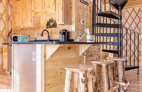 This exquisite yurt features a full-sized kitchen with granite countertops, a master bedroom with a flat-screen TV, and a stylish loft area perfect for relaxation. You'll enjoy modern appliances, a walk-in tile shower, and plush new linens throughout the space. Step outside onto the expansive wraparound deck boasting stunning mountain views where you can unwind in the private hot tub or grill up a delicious meal on the gas grill. The stargazing ceiling lets you gaze at the night sky in comfort while enjoying board games or catching up on shows with loved ones, making it a delightful retreat for all your wedding party needs.