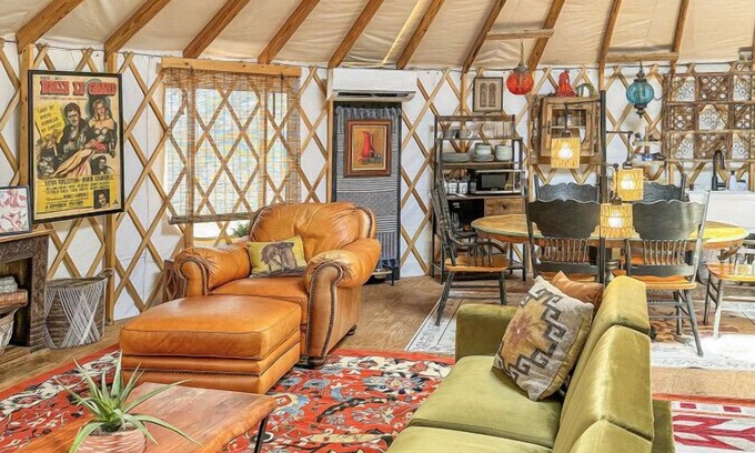 Big stars under a big yurt at the gateway to The Big Bend ! This heated and insulated beautifully decorated with west Texas and boho decor has beds to comfortably sleep four and has room to sleep additional guests upon request. Casa Estrella feels adventurous and unique just like the terrain of Far West Texas and when you break from the terrain you can enjoy wifi, smart tv, nice cool ac or a warm escape from the cool desert nights. Rest and relax in the true to western fashion clawfoot tub or shower under the stars in a “perfect for the dessert” outdoor shower. West Texas cuisine is just minutes away but if the yurt is where your hat hangs, Casa Estrella boasts a stocked kitchen for refueling and an outdoor grilling area for making nourishing meals for you and your fellow guest.