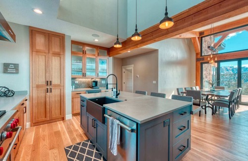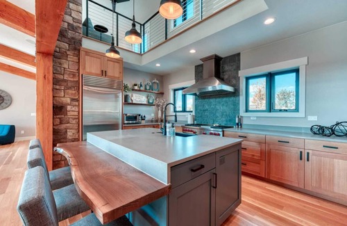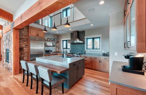 Kitchen - The luxury gourmet kitchen comes fully stocked with everything you need to make meals at home. Wolf Range, Sub Zero fridge, wine fridge, kitchen island with wood breakfast bar and seating for 3, and a Keurig coffee maker with complimentary coffee pods.