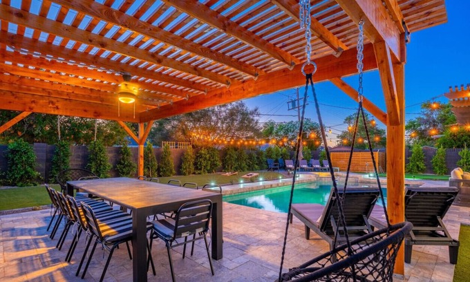 Luxury newly remodeled home just 3 minutes to old town Scottsdale! Equipped with POOL and amazing backyard. Walk to all that the old town has to offer including, stadium, bars, restaurants, shops and more. Golf is an arms reach in any direction .Relax in this open layout, 5 bed house that comfortably sleeps 13+ guests. Huge kitchen & Island, bar seating, open to Living Rm w/ pocket sliders to POOL. At the house, you can enjoy your relaxing time in the heated pool, in ground hot tub, playing games in the yard, sitting under the twinkle lights, or a friendly game of putt putt on the custom putting green.!