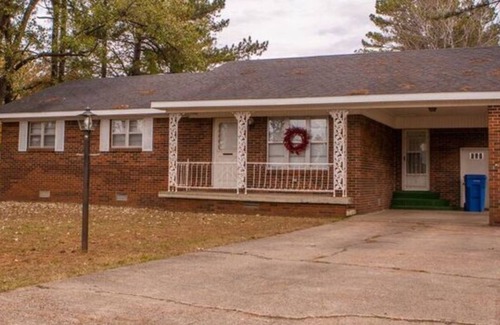 This home is excellent for business, recreational, and personal travel. It sits on a large, one acre lot surrounded with beautiful, grand pine trees shading a spacious deck perfect for grilling and morning coffee. The plentiful living room houses a large 55” smart tv with local cable and Wi-Fi as well as comfortable, plush furniture to make you feel at home. A quaint, fully equipped, eat-in kitchen also offers a two-stool bar, dishwasher and all cooking amenities. Basic breakfast items provided. Laundry room has a clean washer, dryer, and iron/ironing board. The airy three bedrooms have plush linens and accommodate a king, a queen, and two twin beds, with large closets. The master bedroom offers a half bath for privacy. The large full bath has a handicap accessible, walk-in shower, and plenty of counter space. All luxury linens for bed, bath and kitchen are provided as well as infant pack-n-play and highchair. The house has well lit covered parking and carport, as well as, front porch access.